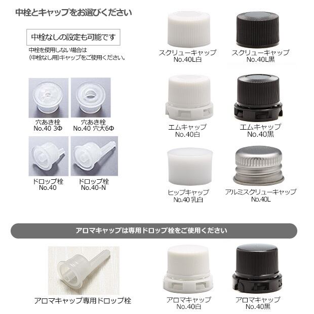 キャップと中栓、またはスプレー、ポンプなどの部品をお選びください。