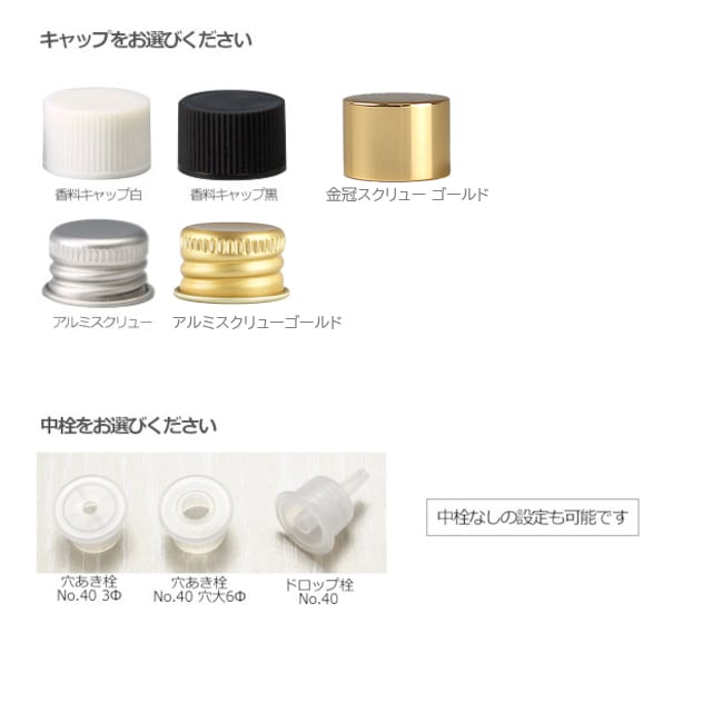 キャップをお選びの場合は中栓をお選びください。「穴あき栓3φ」はさらさらの液体向け、「穴開き栓6φ」はとろみのある液体向け、「ドロップ栓」はアロマオイル向けです。